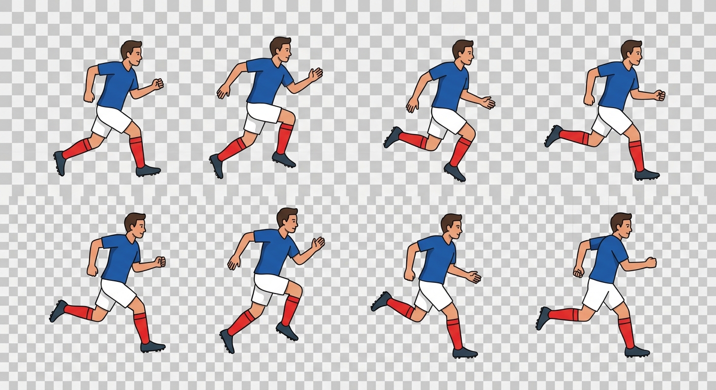 "Professional 2D soccer player sprite sheet, SIDE VIEW running animation, Each frame must be DIFFERENT. Show a TRUE running cycle with distinct leg and arm positions. 8 UNIQUE frames in one horizontal row, perfectly aligned, same character, same scale. modern flat game style, clean outline, dynamic motion, strong silhouette, video game asset, transparent background. IMPORTANT: NO duplicated frames NO repeated poses NO identical images NOT clipart NOT childish NOT 3D NOT realistic"