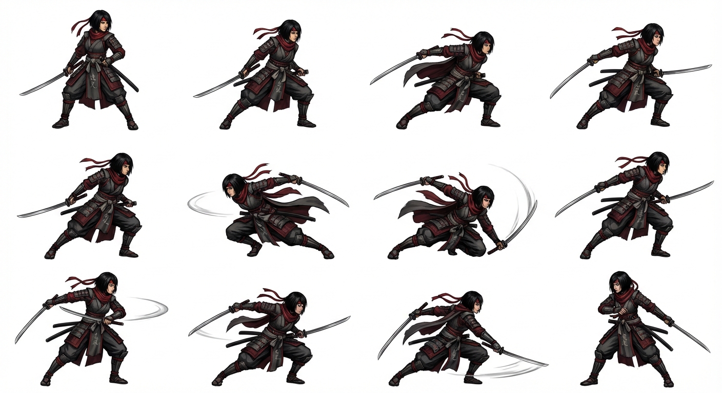"Female ronin warrior in samurai-inspired clothing, muted charcoal gray and deep red accents, short black hair with a red headband. She wields dual katanas and wears layered fabric, light armor, cloth sashes with subtle kanji details. Sprite sheet animation showing a backward dodge movement: she quickly slides or steps back while lowering her stance, cloak and scarf trailing with motion, feet skimming the ground. Clear anticipation → movement → recovery frames. Minimal background, consistent character proportions, clean silhouette, readable motion arcs, game-ready 2D sprite sheet, high contrast, painterly but crisp style, suitable for indie action or roguelike game."