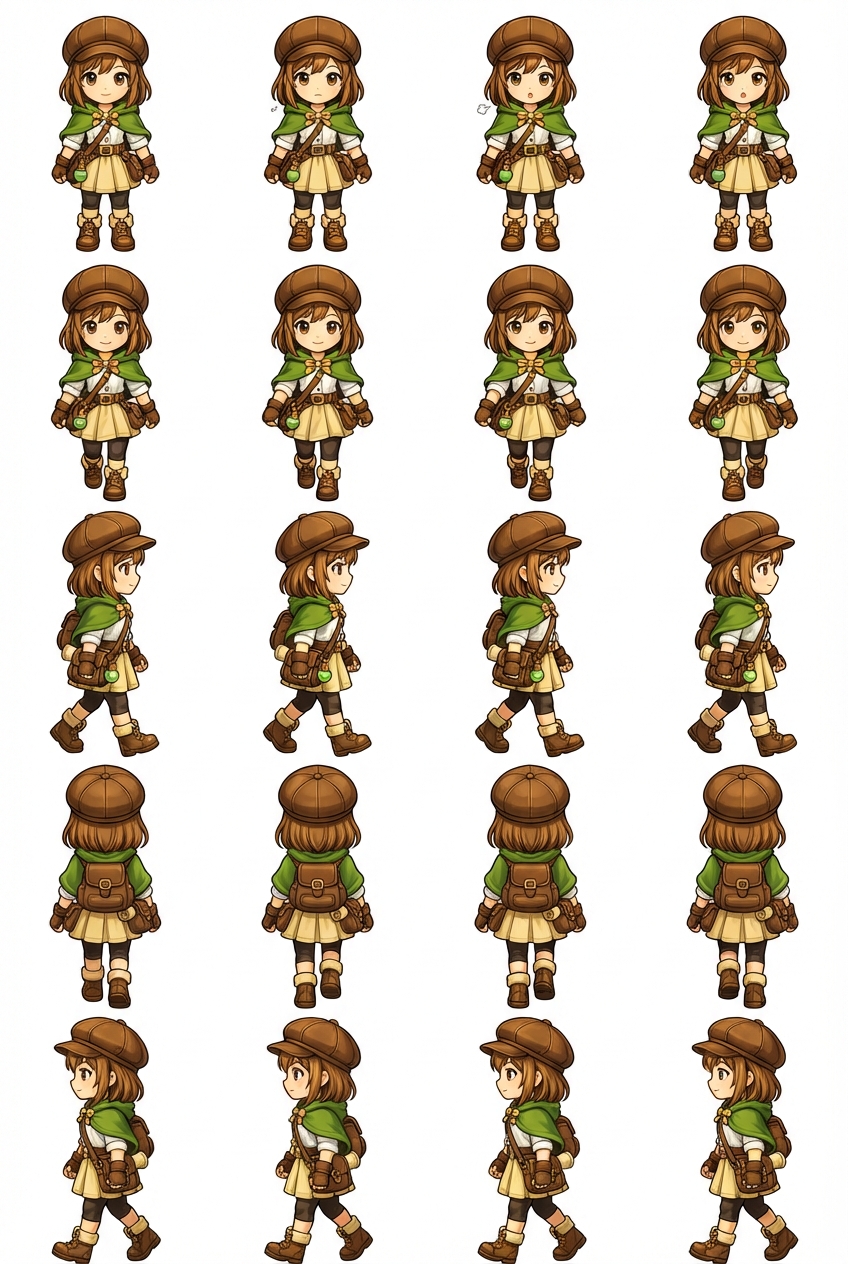 "generate a sprite sheet based off this character standing in idle position and walking in all South East North West directions"