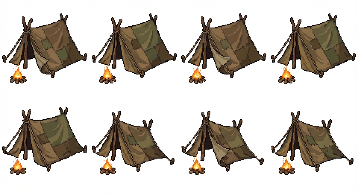 "make me a 2d sprite of an old and hand made like in a survival game tent , in Pixel Art style"