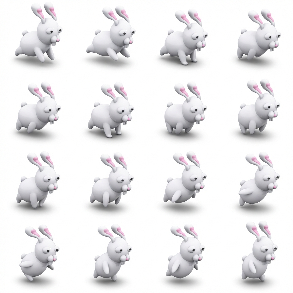 "Create a 16-frame sprite animation of the SAME cute 3D rabbit running. This is a RUN CYCLE animation. CHARACTER RULES (VERY IMPORTANT): - EXACT same rabbit in all frames - Same size, proportions, color, fur texture - Same camera angle (side view, slight 3/4 if needed) - Same distance from camera - Same lighting - No camera movement - No rotation of the character - No background elements - White or transparent background ONLY RUNNING MOTION DETAILS: - Rabbit is running forward in place (not moving across screen) - Legs must visibly move in a natural run cycle - Front and back legs alternate properly - Body compresses slightly when legs touch ground - Body stretches slightly when airborne - Ears bounce naturally with a slight delay (secondary motion) - Head stays stable, slight forward lean - Tail moves subtly with motion FRAME PROGRESSION (IMPORTANT): - Each frame must show a SMALL incremental change - Motion must be smooth and continuous - No repeated frames - No sudden jumps STYLE: - 3D cartoon style - Smooth shading - Soft realistic lighting - Clean edges - No motion blur - No text - No props OUTPUT REQUIREMENTS: - 16 individual PNG images - Square aspect ratio (512x512 or 1024x1024) - Transparent or pure white background - Frames suitable for sprite sheet animation This animation will be used in a web application sprite sheet. Maintain PERFECT consistency across all frames. "