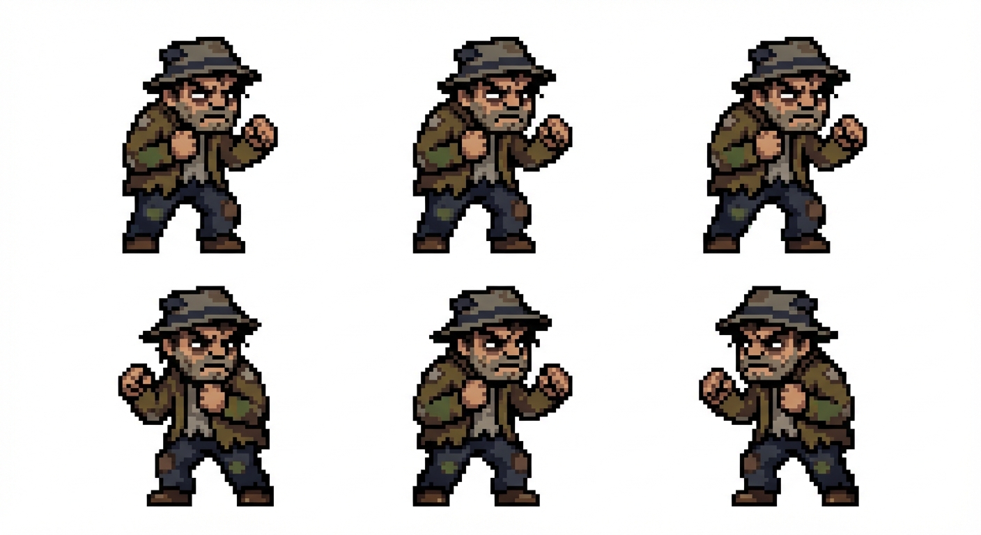 "A pixel art hobo, dirty looking with a mean face, ready to fight"