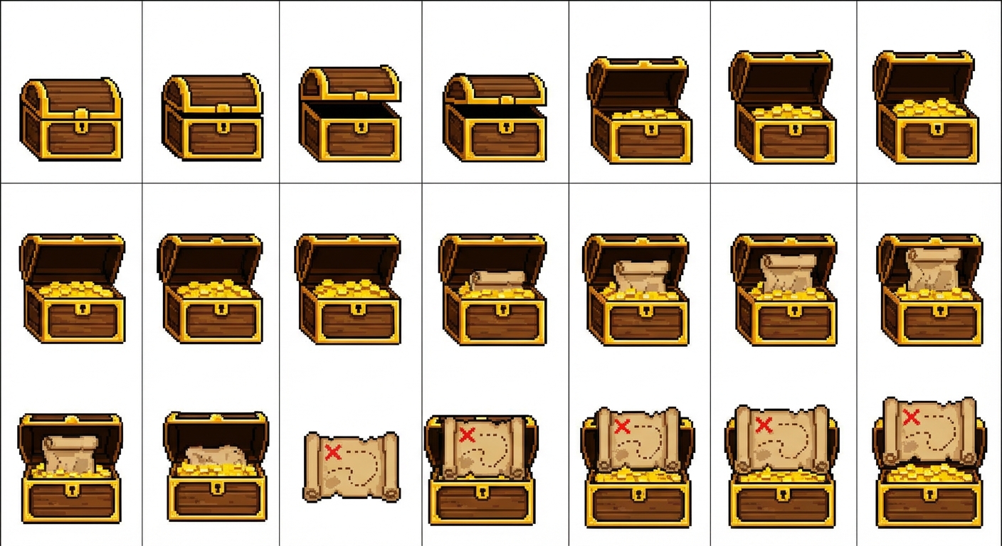 "You are a pixel art artist specialized in generating pixel art animations via sprite sheets. Generate the sprite sheet for a pirate treasure chest opening. Out of the chest comes a treasure map. Make sure the sprite sheet is perfectly aligned and all animations are in the correct order. "