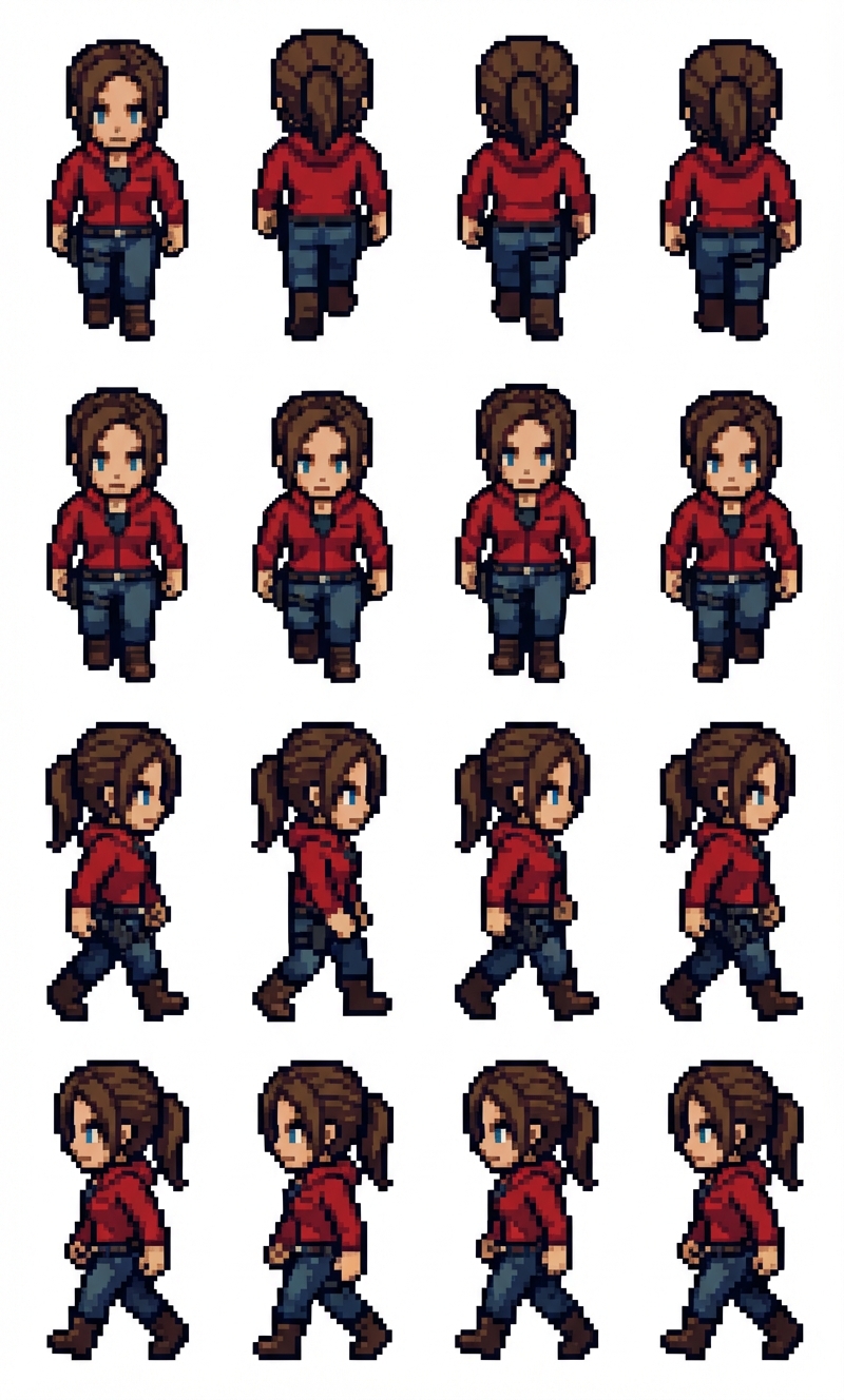 "Walk up, walk down, walk right, walk left. 4 frames for each one + same number of pixels apart between each frame"
