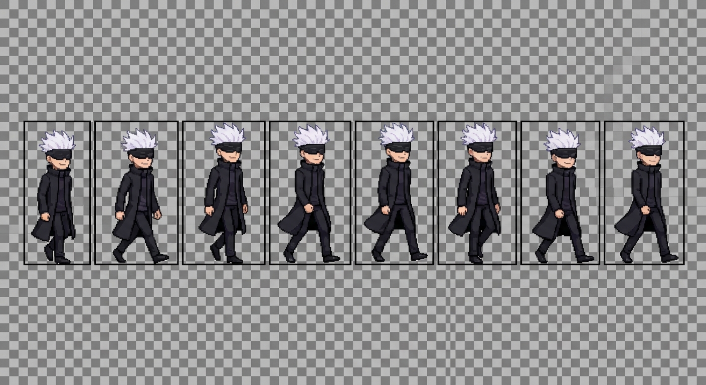 "side view walk animation sprite sheet of an anime-inspired male sorcerer character, visually extremely close to a white-haired blindfolded anime sorcerer but fully original, tall and slim proportions, very light white spiky hair pointing upward, black cloth blindfold covering eyes, sharp jawline, calm and confident expression, modern black long coat with high collar, minimalist outfit, no armor, no logos, no symbols, clean elegant silhouette, powerful but controlled presence, LIGHT WALK CYCLE, smooth casual steps, subtle coat movement, no exaggerated motion, no combat pose, 8 frames, horizontal sprite sheet, single character only, consistent proportions across all frames, centered in each frame, pixel art style, clean outline, simple readable shading, transparent background, game-ready, suitable for commercial video game use "