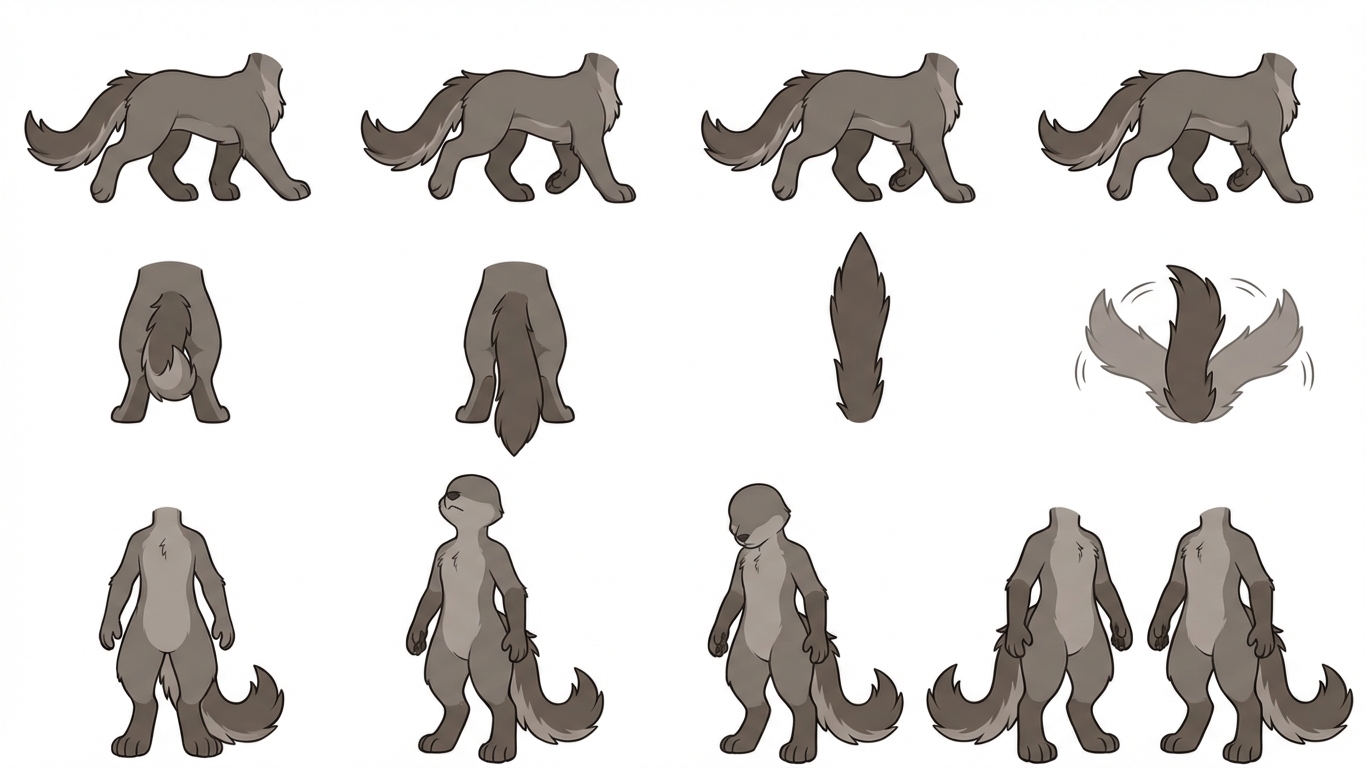 "Chibi four legged mammal, headless body, walk animation + separate sprites for tail between legs, tail downwards, tail up, tail wagging left and right, neutral colors, separate sprites between standing on two legs with others facing forwards, slightly up, slightly down and beside body"