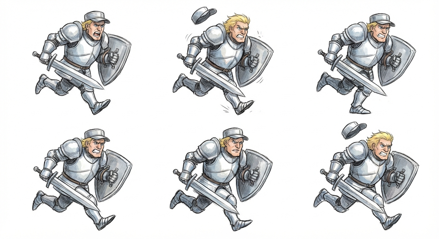 "A big templar knight. He has blonde hair and blue eyes. His armour is bright silver. He has a cap, a large sword and large shield. He's running with an angry expression., in Hand-Drawn Art style"