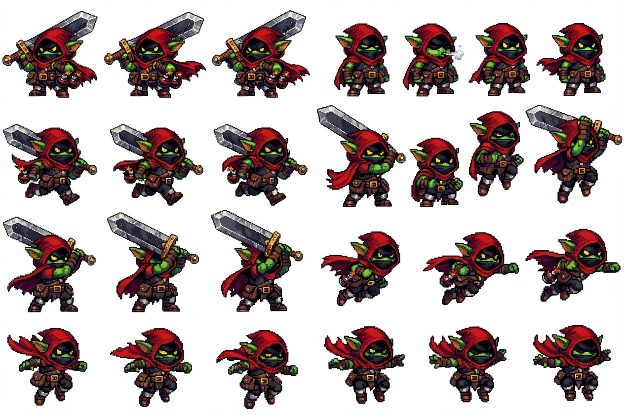 "Generates a spritesheet for idle, run, attack, jump, dash, and fall animations"