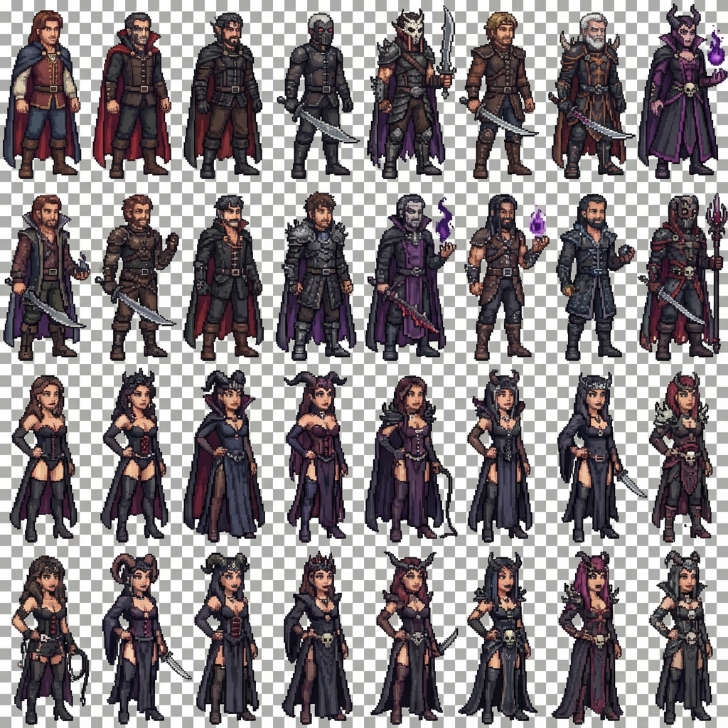 "I need a 1024x1024 sprite sheet with transparent background that consists of 32 frames, 8 columns and 4 rows of 128w x 256h sprites. These are to be Hi-res pixel art adult film star fantasy villains, full view and characters should be facing to the right. We want lots of diversity and flavor. 16 males and 16 females to keep it even."
