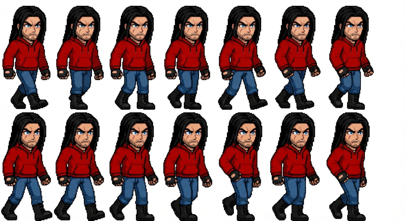 "Adult Male, Long Black Hair, Blue Eyes, Scar Under His Left Eye, Stubble Beard, Wearing A Red Hoodie, Blue Jeans, Black Boots, Black Fingerless Gloves, With An Aggressive Look"