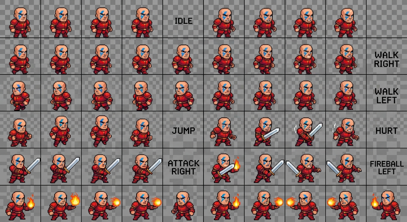 "Personagem: Guerreiro masculino careca Estilo indie game Corpo compacto e levemente musculoso Marca de raio azul no rosto (estilo pintura facial, semelhante a Kratos, mas original) Armadura medieval vermelha com detalhes sutis dourados Expressão séria e determinada Visual forte e silhueta bem definida 🎨 Estilo Visual: Pixel art estilo 16-bits Inspirado em jogos como Mega Man, Celeste ou Dead Cells Perspectiva lateral (side view 2D) Contorno bem definido Sem desfoque Sem efeito 3D Sem sombreamento suave Fundo totalmente transparente Alta legibilidade do personagem 🎬 Animações necessárias: IDLE (parado) – 4 frames em loop ANDAR PARA DIREITA – 6 frames suaves ANDAR PARA ESQUERDA – 6 frames (não apenas espelhado, mas animado corretamente) PULO – 2 frames QUEDA – 2 frames ATAQUE COM ESPADA PARA DIREITA – 4 frames ATAQUE COM ESPADA PARA ESQUERDA – 4 frames ATIRAR BOLA DE FOGO PARA DIREITA – 4 frames (com pose de conjuração e disparo) ATIRAR BOLA DE FOGO PARA ESQUERDA – 4 frames DANO / HURT – 2 frames 📐 Especificações Técnicas: Cada frame deve ter exatamente 128x128 pixels Todos os frames devem ter o mesmo tamanho Organizar em grade limpa e alinhada Espaçamento uniforme Não cortar partes da espada ou braços Manter o personagem centralizado Entregar como PNG único (spritesheet)"