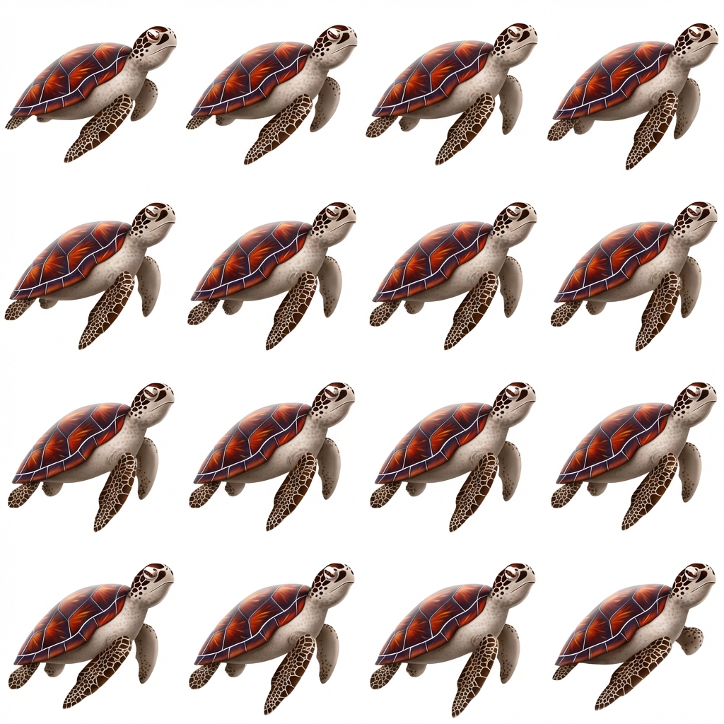 "Create a 16-frame sprite animation of the SAME realistic turtle walking slowly. This is a WALK CYCLE animation. CHARACTER RULES (VERY IMPORTANT): - EXACT same turtle in all frames - Same shell pattern, color, and texture - Same camera angle (side view preferred) - Same scale and position - No camera movement - No rotation - No background - White or transparent background only WALKING MOTION DETAILS: - Turtle walks slowly and heavily - One leg moves at a time (real turtle behavior) - Body shifts weight slightly left and right - Shell remains heavy and stable - Slight head forward movement with each step - No jumping or bouncing - Very grounded motion FRAME PROGRESSION: - Each frame shows a small, realistic step progression - No duplicated frames - Motion must feel slow, heavy, and natural - Smooth transition between frames STYLE: - Semi-realistic 3D turtle - Natural earthy colors - Soft lighting - Clean edges - No shadows outside turtle - No motion blur - No text or props OUTPUT REQUIREMENTS: - 16 individual PNG images - Square aspect ratio (512x512 or 1024x1024) - Transparent or white background - Consistent framing for sprite sheet usage This animation will be used in a web-based sprite sheet. Maintain PERFECT consistency across all frames. "