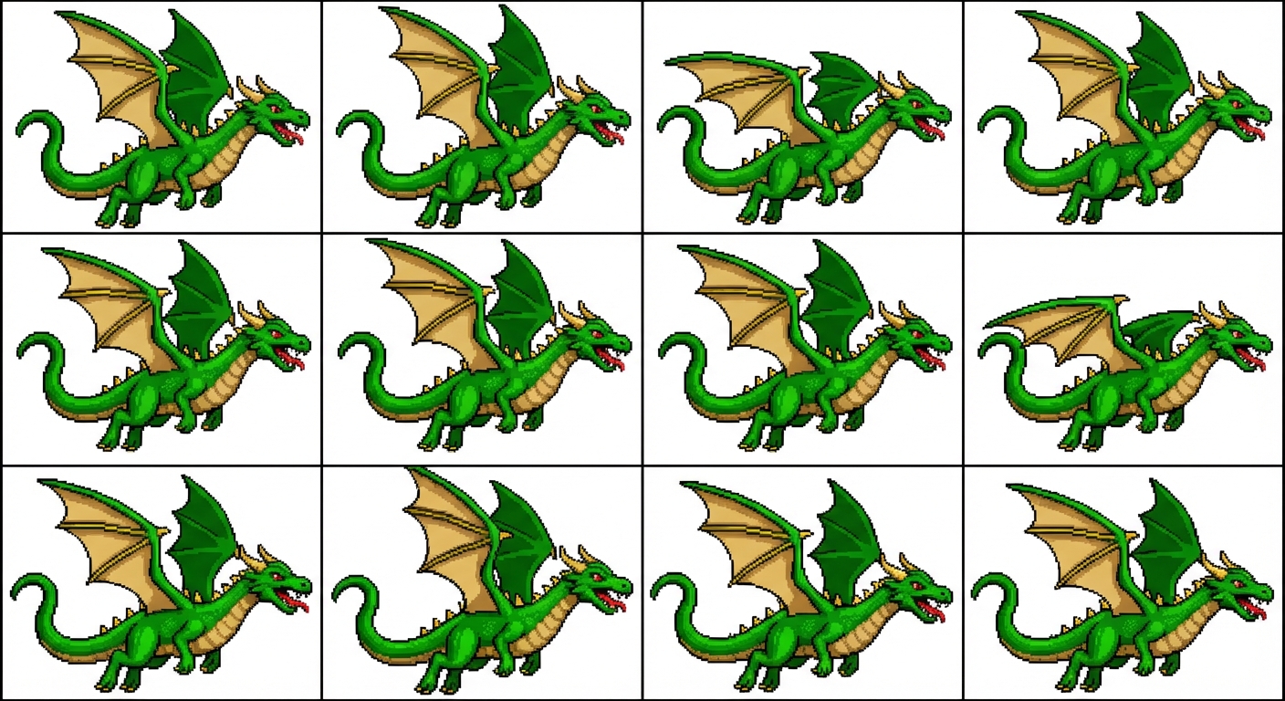 "A full-body pixel art sprite of a classic Western dragon in flight, isolated on a solid neutral gray background. The dragon has vibrant green scales with a pale tan/gold underbelly and wing membranes. It features sharp, angular wings with visible golden 'fingers' or struts, small yellow dorsal spikes, and a long, curved tail. The head is detailed with a red eye, open mouth showing a red tongue, and small yellow horns. Use a clean, 16-bit aesthetic with deliberate shading and a slight black outline to define the silhouette. No gradients—only distinct pixel blocks for a crisp retro-gaming look."