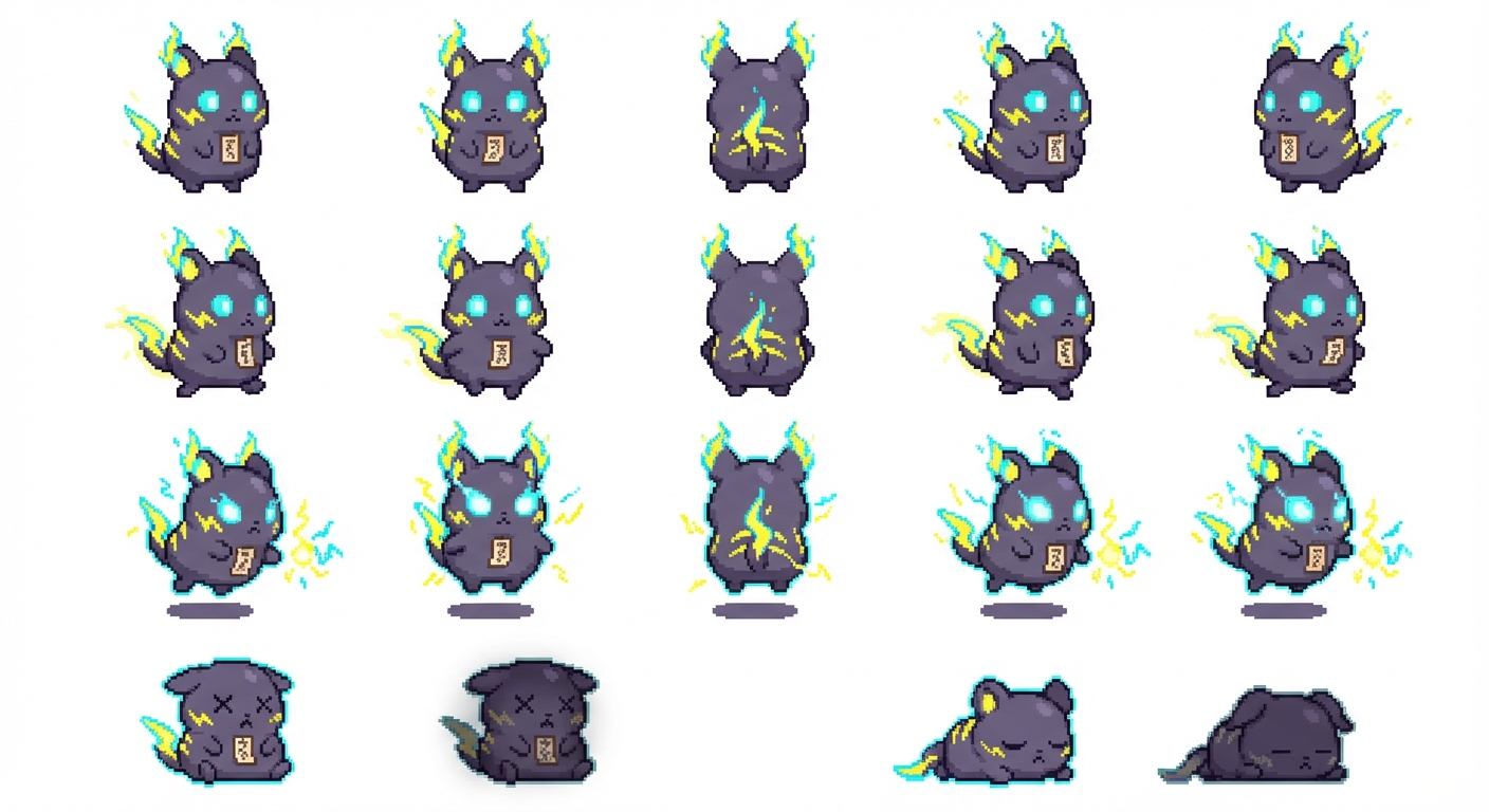 "A cute, Pokemon-like creature named “Voltubu” – an electric/ghost support-type companion with a playful but slightly spooky personality. Overall concept: - Small, round-bodied creature that looks like a floating lantern spirit crossed with a hamster. - Primary role: agile support/trickster, using electricity and ghostly illusions rather than brute force. - Expression: big curious eyes, mischievous smile, always looks like it’s plotting a harmless prank. Body & proportions: - Chibi proportions: big head, small body, stubby limbs. - Height similar to Pikachu; slightly floating rather than firmly standing. - Soft, plush-like body with subtle glow around the edges. Colors: - Main body: soft charcoal gray with a faint purple tint (ghostly). - Accent markings: bright neon yellow electric patterns (lightning bolt motifs) on cheeks, tail, and shoulders. - Eyes: large, bright cyan with a subtle glow. - Inner glow: a soft bluish-white light that shines from inside its body, especially when using abilities. Key features: - Ears: lantern-flame shaped ears, tipped with flickering, semi-transparent electric “flames”. - Tail: long, wispy, ghost-like tail that forms a crooked lightning bolt shape; semi-transparent and slightly trailing motion blur. - Cheeks: small glowing electric sacs (like rosy cheeks) that spark when excited. - Hands/feet: tiny paws with 3 rounded digits; faint glowing lines on the back of the hands. - Aura: subtle, wispy ghost mist around lower body and tail, plus occasional tiny spark particles. Outfit/details: - A small, floating charm hanging from its neck on a thin ribbon: a stylized paper talisman with a lightning symbol. - Optional tiny stitched patch on its body in the shape of a lightning bolt, as if it’s a stuffed toy repaired with magic. Personality cues: - Cheerful, playful, a little mischievous but friendly. - Loves to surprise others with harmless jump-scares and light shows. - Confident pose in battle, but non-threatening and cute. Art style: - Bright, clean cel-shaded style similar to modern Pokémon sprites. - Clear lines, simple shading, high readability at small sprite sizes. - No background, transparent or flat neutral background. Sprite sheet requirements: Generate a 4-direction sprite sheet (front, back, left, right) with the following animations for Voltubu. Keep proportions consistent across all frames. 1) Idle (looping): - 3–4 frames per direction. - Voltubu gently bobbing up and down as if floating. - Tail and lantern-flame ears flicker softly; cheeks occasionally emit a tiny spark. - Eyes blinking occasionally. 2) Walk/float (looping movement): - 4–6 frames per direction. - Small forward bobbing motion; limbs make tiny paddling motions. - Tail trails slightly behind the direction of movement, with ghostly motion blur. - Electric patterns shift slightly to show motion. 3) Attack (electric/ghost burst): - 4–6 frames per direction. - Voltubu leans forward, cheeks and inner glow brighten dramatically. - Small electric arcs form between its ears and tail. - A short-range electric/ghost burst appears in front of it: jagged yellow electricity mixed with wispy blue ghost flames. - Final frame should look like a strong “impact” pose, readable in small size. 4) Hurt / damage: - 2–3 frames per direction. - Voltubu briefly squashes or tilts backward as if pushed. - Eyes squeezed or small “X” pupils for one frame. - Glow dims for a moment; a tiny spark pops off. 5) Faint / KO: - 3–4 frames, front-facing only is acceptable, but ideally all directions. - Voltubu’s glow fully dims. - Body slowly sinks downward, tail and ears droop. - Final frame: lying on its side or slightly flattened with spiraled or closed eyes. Technical: - Consistent pixel scale and canvas size for each frame. - Enough spacing between frames for easy slicing. - No text, UI, or backgrounds; only the character and its effects. - Ensure silhouette is easily readable and distinct in all directions. , in Pixel Art style"