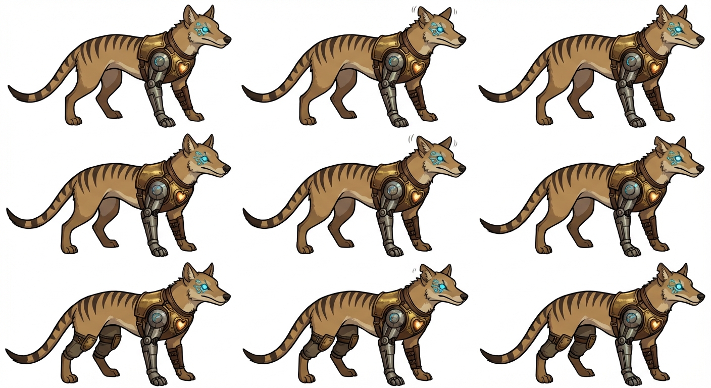 "Thiren is a male anthropomorphic qudrapidle thylacine with a lean, athletic build, sandy‑brown fur, and the species’ iconic dark stripes running across his lower back and tail. His face blends the long, narrow thylacine muzzle with expressive, intelligent eyes— left one natural amber, the other right glowing Aether‑blue with faint circuitry patterns. His right arm is a sleek Aetheran‑Iron construct with matte metal plating and soft blue energy seams, contrasting with his organic left arm wrapped in worn leather bracers. He wears light steampunk‑engineer gear: a brass‑and‑iron chestplate with a glowing heart‑shaped Aether core, reinforced trousers, and subtle mechanical accents. His posture is alert and confident, tail long and striped, ears pointed and expressive, with a faint workshop glow reflecting off his metal arm."