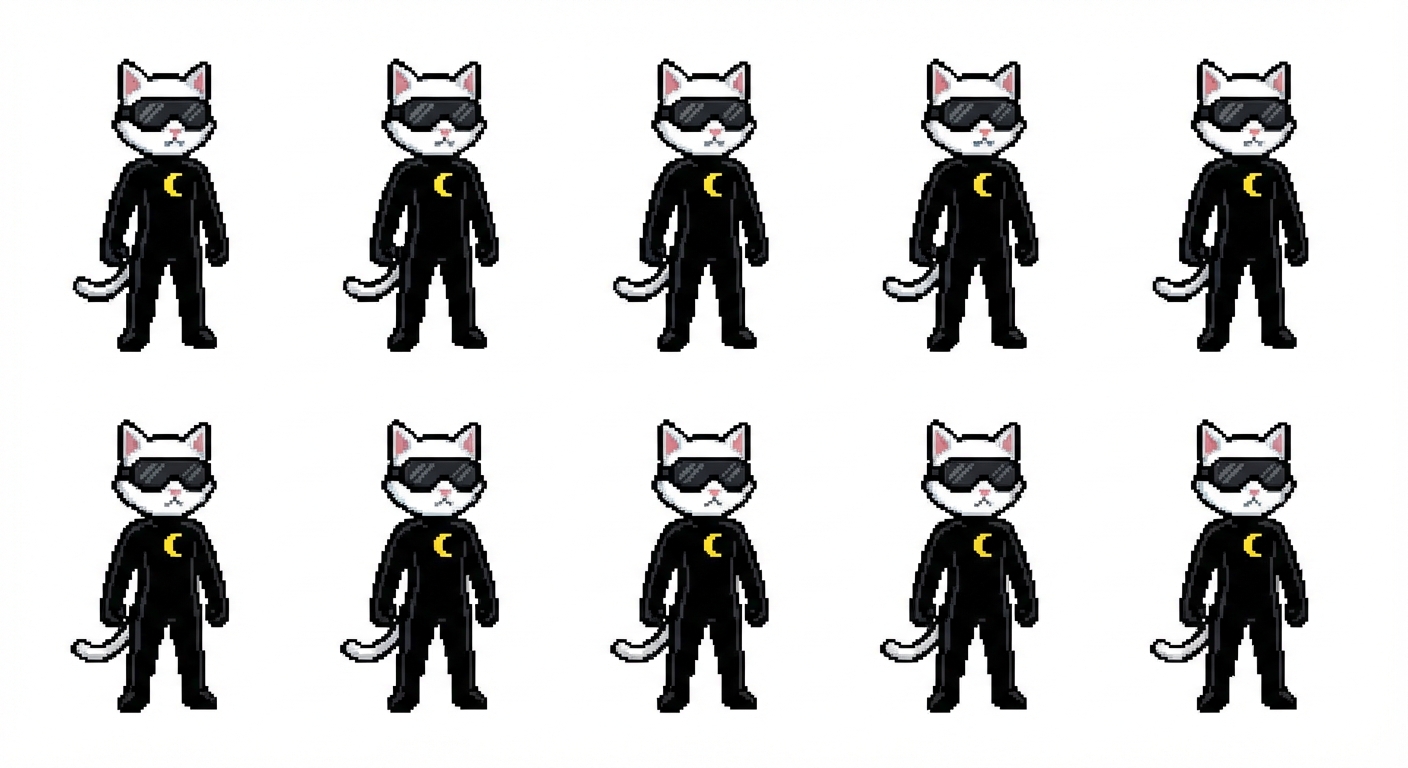 " modify this to a humanoid white cat wearing a black spy suite with a yellow moon on it, the cat is wearing googles over its eyes ( this is front view ) "