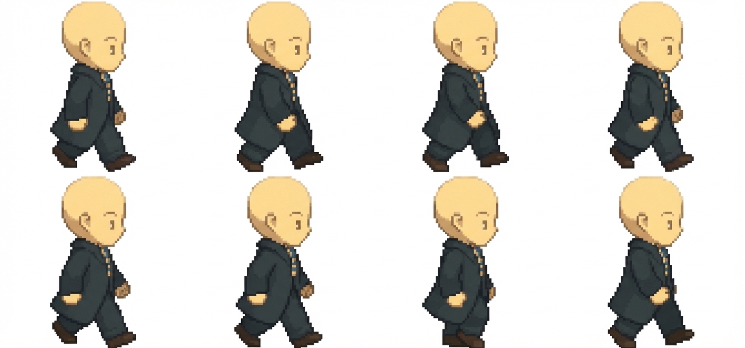 "Can you make a walk cycle of 8 frames of him walking towards the left facing the left"