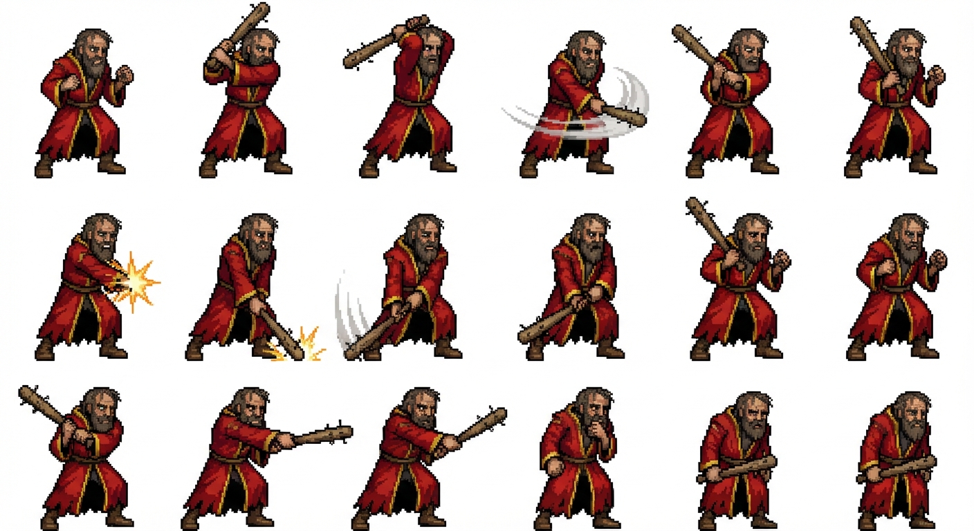 "An ex-noble man in a red robe, haggard, uses a nailbat to fight. jrpg protagonist. He is attacking with his nailbat in a jrpg fight."