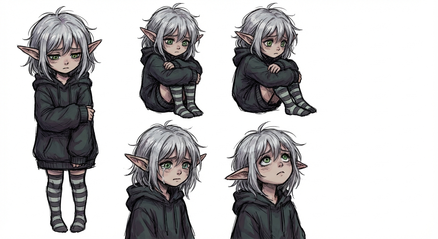"cute little elf girl with pointy ears, silver hair and green eyes, in a vent art style"