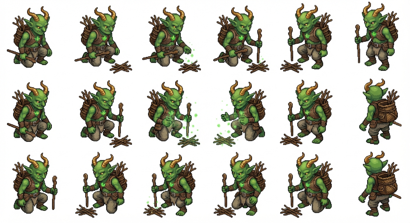 "a goblin who can use simple nature/crafting magic hes a byshcraft survival type goblin hes part easter dragon to though so he has chinese dragon horns , in Isometric Art style"