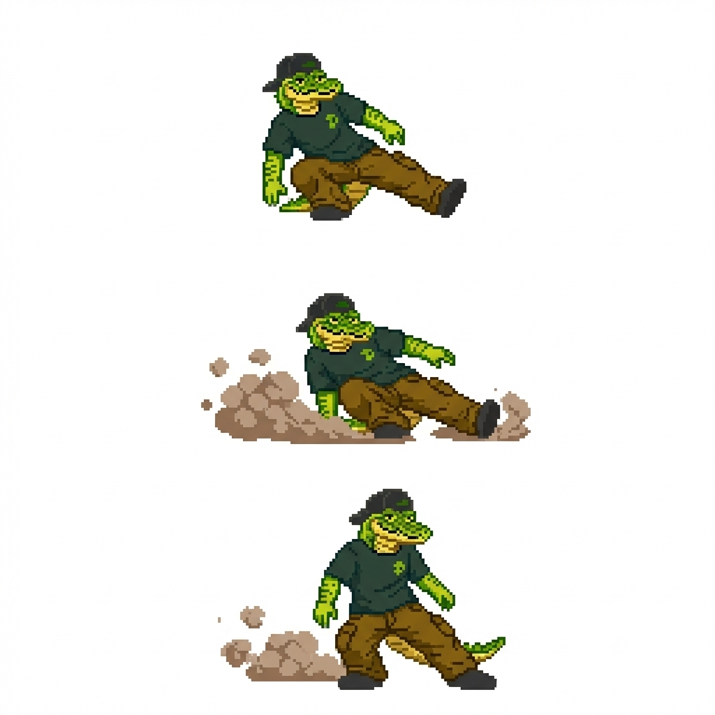 " Three-frame Running powerslide animation. Frame 1: run converts into a low side crouch back towards the ground and chest more towards the air but a bit sideways. Frame 2: deepest skid with maximum sideways lean and dust puff. Frame 3: slide decelerates and the character rises back toward standing. Keep the silhouette clear and readable. "