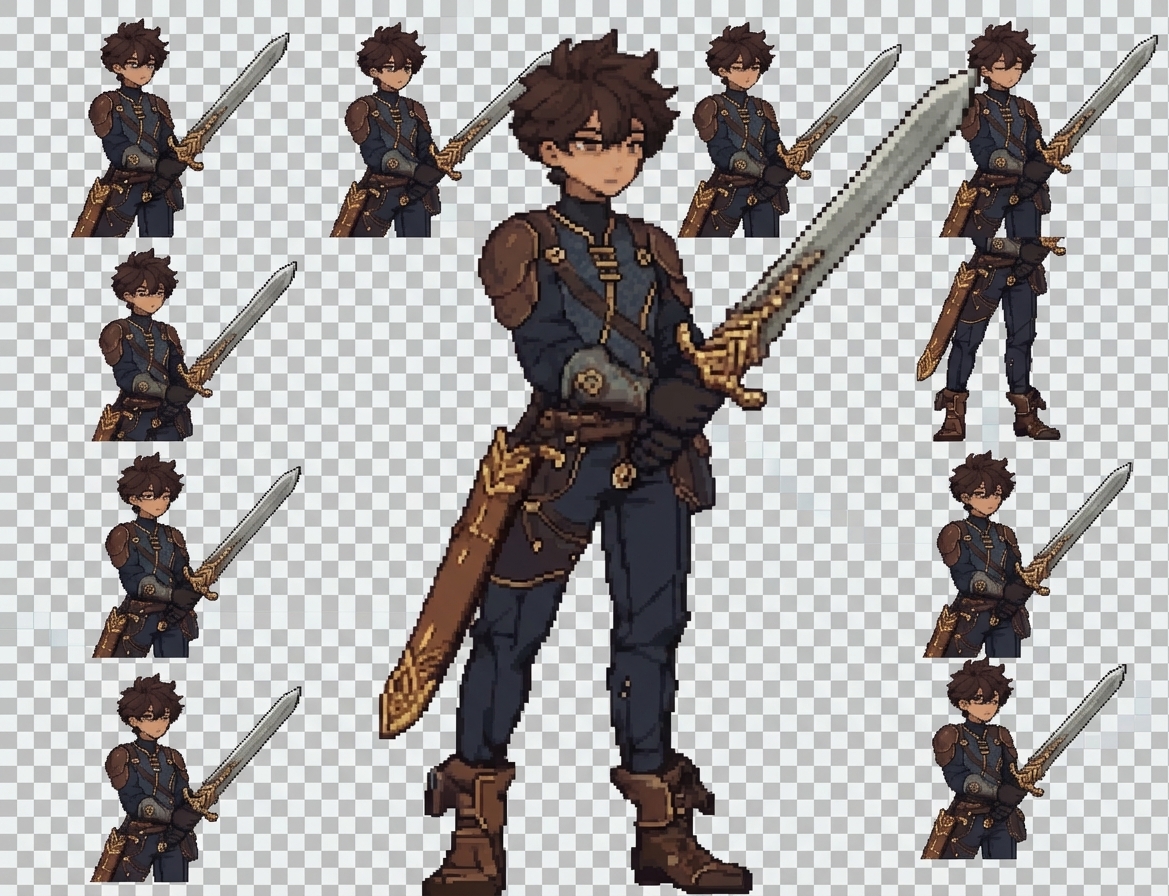 "A detailed 2D pixel art RPG character sprite, a young male knight with messy dark brown hair, wearing dark blue and brown armor with gold accents, holding a long sword. The character stands in a relaxed idle stance. Create a smooth idle animation loop with subtle breathing motion (chest and shoulders gently rising and falling), natural blinking (eyes closing and opening at irregular intervals), slight hand movement to simulate grip adjustment, and a gentle sway of the sword to add realism. The movement should feel alive but minimal, suitable for an RPG idle state. Maintain consistent pixel art style, clean outlines, soft shading, and proper lighting. The animation should be seamless and loopable, with 6–12 frames. Transparent background. High quality sprite sheet. --animation loop --sprite sheet format --frame consistency --no distortion, no extra limbs, no blurry pixels"