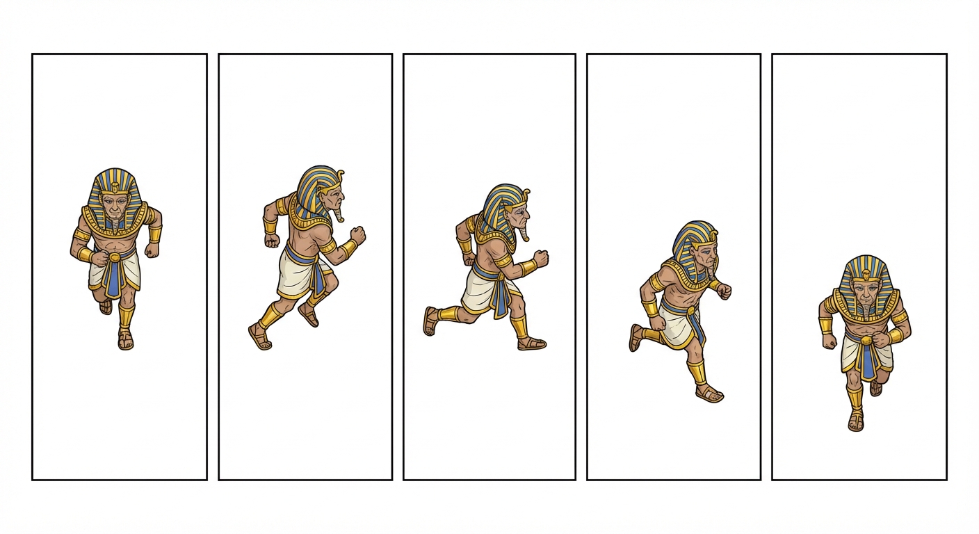 "A fixed overhead camera captures the full figure of an ancient Egyptian pharaoh dressed in ornate gold and blue regalia. The pharaoh, wise and elderly, begins a smooth, continuous run cycle in each of the five separate sections of the frame in top-down view, running in five different directions. His stride is rhythmic and dignified, with arms and legs pumping in clear, coordinated motion. The camera is fixed and remains constant, emphasizing his movement., in Hand-Drawn Art style"