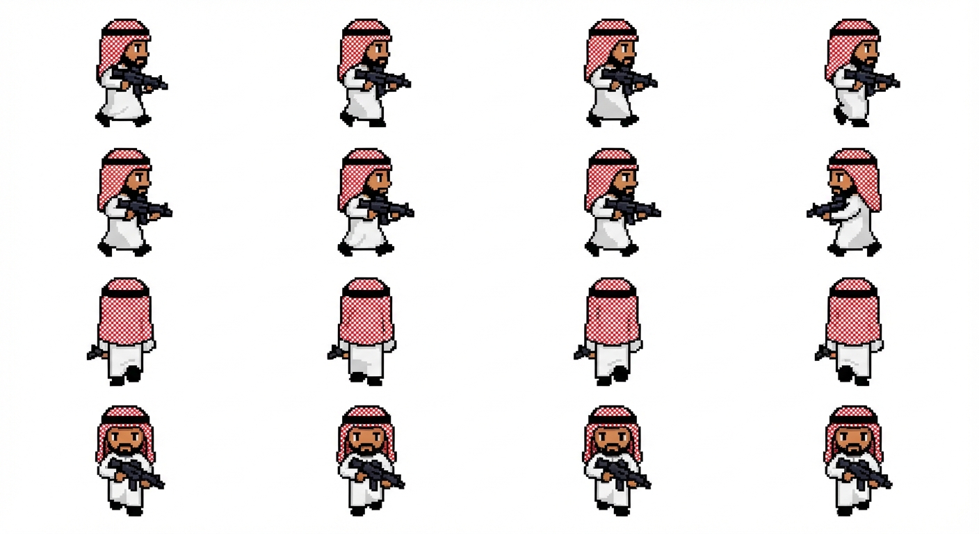 "Professional 2D pixel art sprite sheet, 4x4 grid, chibi short-height Arab character (Habibi) wearing a white thobe and ghutra, holding a compact tactical rifle. 16 frames total. Row 1: Side view facing left, walking animation. Row 2: Side view facing right, walking animation. Row 3: Back view facing up, walking animation. Row 4: Front view facing down, walking animation. Simple flat color background, consistent character proportions, high contrast, game-ready asset."