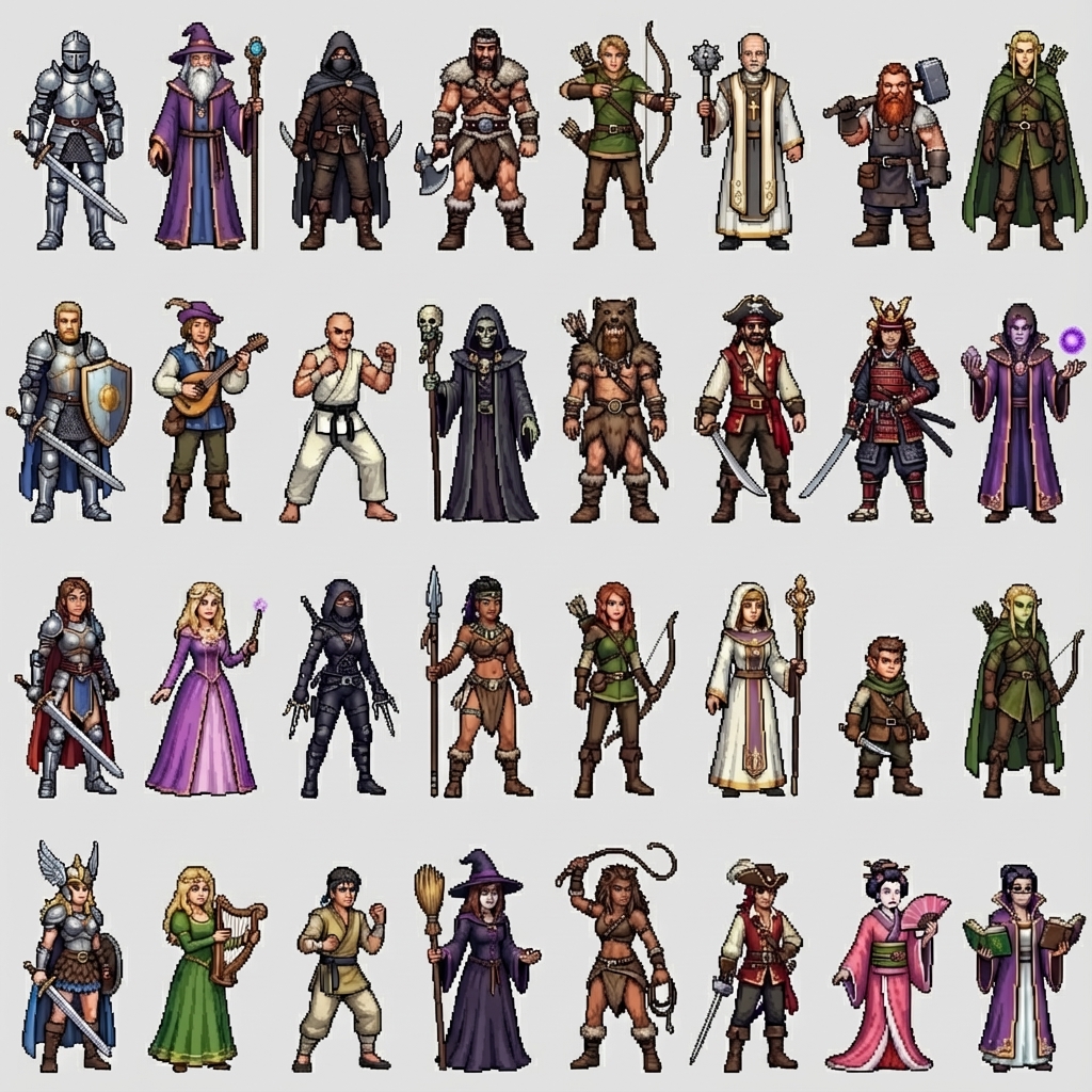 "I need a 1024x1024 sprite sheet with TRANSPARENT BACKGROUND, not a white background, that consists of 32 frames, 8 columns and 4 rows of 128w x 256h sprites. These are to be Hi-res pixel art RPG Fantasy heroes with lots of diversity and flavor. 16 males and 16 females to keep it even. , in Pixel Art style"