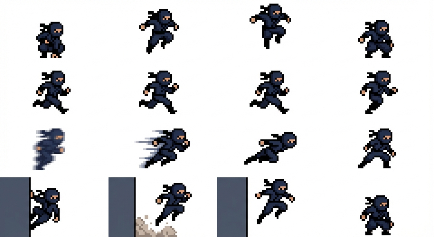 "a ninja with a jump, run, dash and wall jump 16x16"