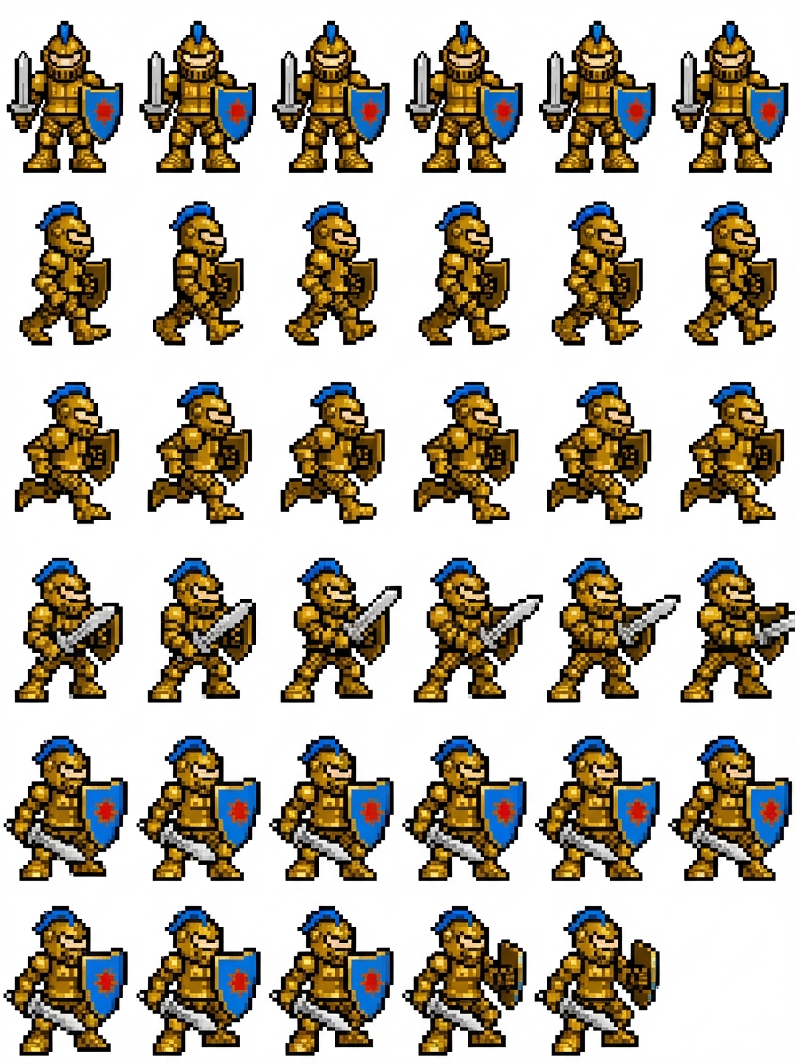 "Make the character 64x64. #Spritesheet Standards Row 1: Idle animation (all directions if applicable) Row 2: Walk animation (all directions if applicable) Row 3: Run animation (all directions if applicable) Row 4: Attack animation (all directions if applicable) Row 5+: Special actions, skills, or state changes"