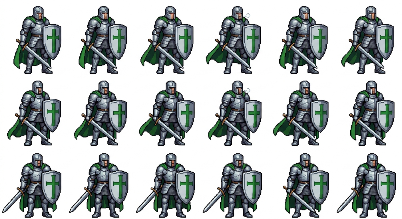 "I need a knight idle sprite . The knight is full armor with a shield and a sword , he has a green cape and the shield has on it a green plus ."