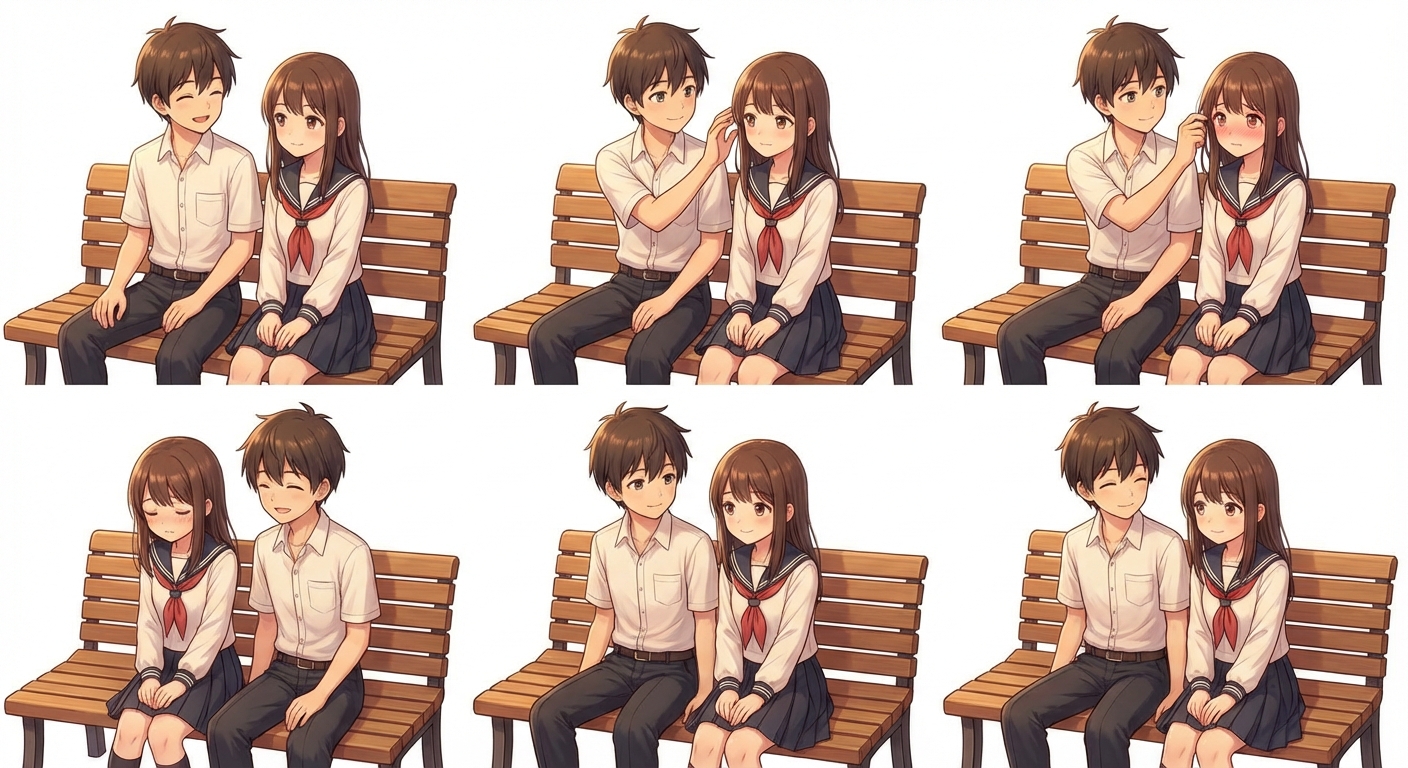 "anime style, a junior high school boy and girl sitting close together on a bench, soft warm atmosphere, the boy smiles gently and slowly raises his right hand toward the girl's hair, smooth and natural movement, the girl's hair slightly moves as if touched by a soft breeze, the boy gently tucks her hair behind her ear, the girl blushes and smiles shyly, light romantic mood, soft lighting, smooth animation, cinematic feeling"