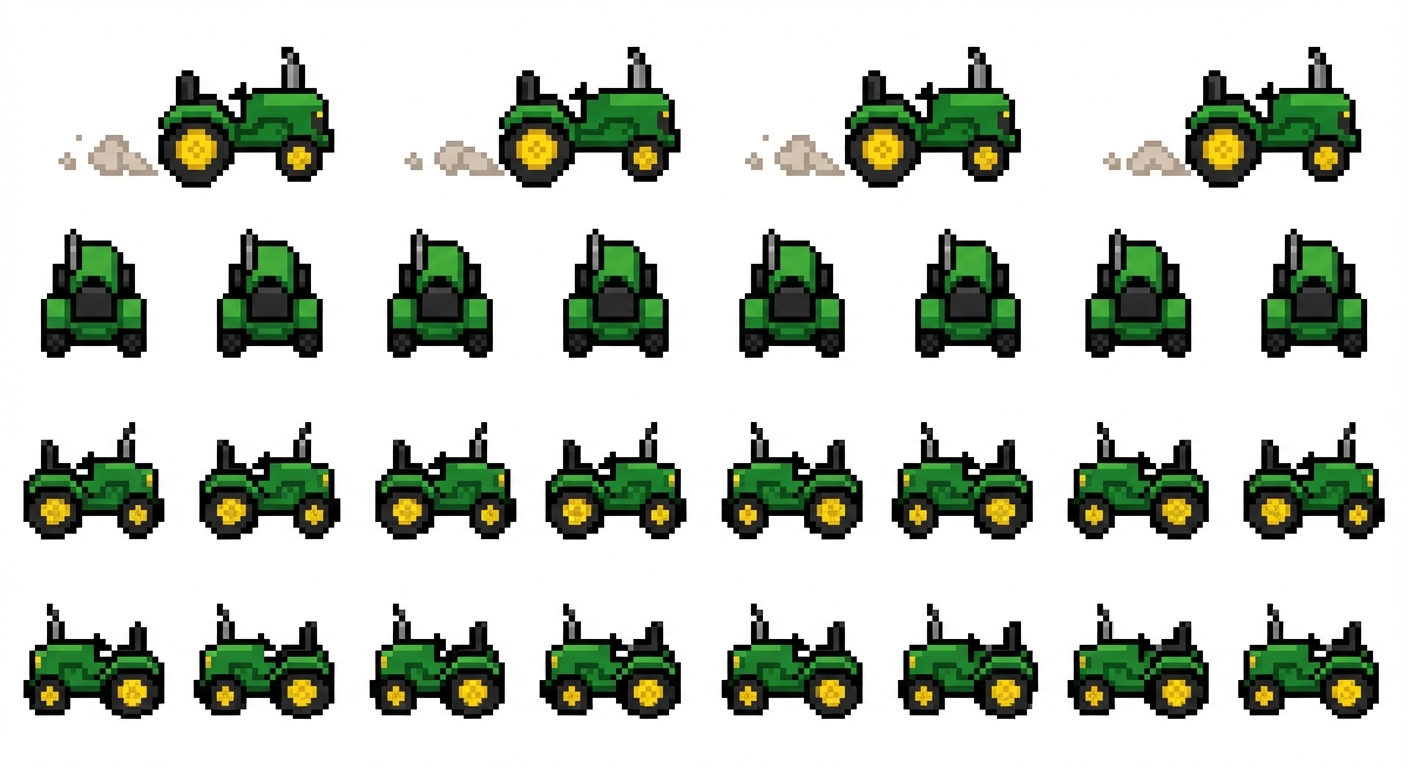 "Create a top-down pixel art tractor for a farming game similar to Stardew Valley. Style: - Pixel art - 32x32 or 48x48 sprite - Top-down view - Bright farming colors - Cartoon style similar to Stardew Valley Tractor design: - Green tractor - Yellow wheels - Inspired by John Deere design - Simple deer-style logo on the hood - Black seat - Gray exhaust pipe - Front headlights Animations needed: 1. idle_down 2. idle_up 3. idle_left 4. idle_right Movement animations: 1. drive_down 2. drive_up 3. drive_left 4. drive_right Each animation: 3–4 frames Extra: Small dust particles when moving."