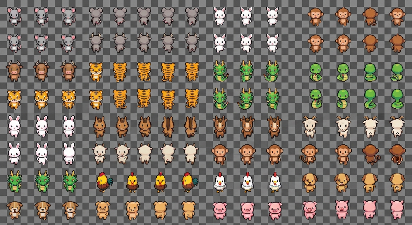 "Create a pixel art sprite sheet for a 2D top-down game: - Each frame sized 32x32 pixels - Transparent background - 12 Vietnamese zodiac animals (rat, ox, tiger, rabbit, dragon, snake, horse, goat, monkey, rooster, dog, pig) - Each animal has walking animations in 4 directions: - 4 frames walking down - 4 frames walking up - Frames arranged in rows, each row is one direction animation for one animal - Style: cute chibi, 16-bit retro pixel art - Bright colors and clean outlines suitable for GameMaker 2D top-down games - Clear grid layout for easy slicing into individual frames "