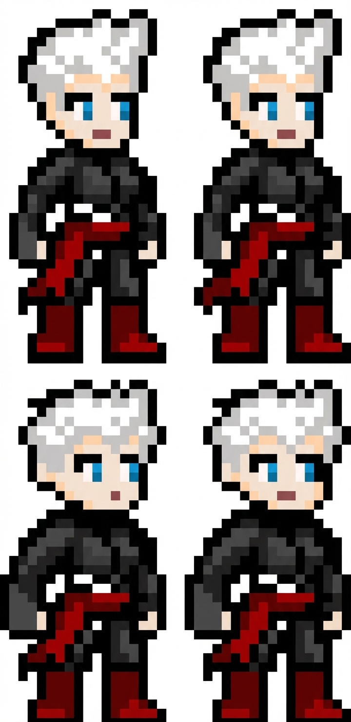 "Create a male character with fair skin and blue eyes, with white hair that is spiked a bit, wearing a black hunter's suit, red boots, and a torn red sash around the waist., in Pixel Art style"