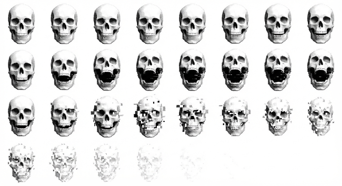 "8bit low poly glitchy digital white skull going from closed mouth to it opening its mouth becoming distorted and vanishing "