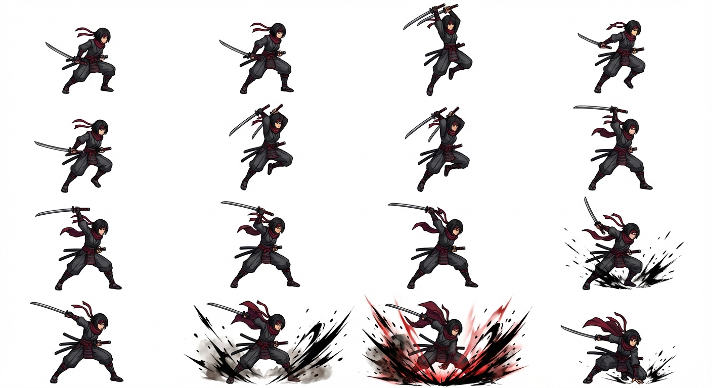 "Female ronin warrior with dual katanas, samurai-inspired outfit in charcoal gray with deep red accents, short black hair tied with a red headband. 2D sprite sheet animation of a vertical jump attack: she crouches and launches straight upward, blades raised, then descends rapidly in a powerful downward strike. On impact, a dramatic splash effect bursts outward—energy waves, dust, and stylized ink-like slashes radiating from the ground. Cloth, scarf, and cloak snap with the force of the fall. Clear anticipation → jump → apex → descent → impact frames. Strong vertical motion, exaggerated squash and stretch, bold splash VFX, clean silhouette, consistent proportions, minimal background, high-contrast colors, game-ready indie action sprite sheet."
