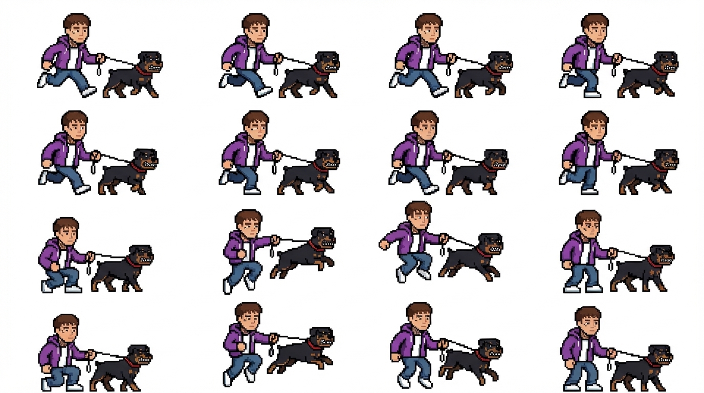 "i need a sprite sheet of my character with the dog on a leash runing (with both legs) and jumping "