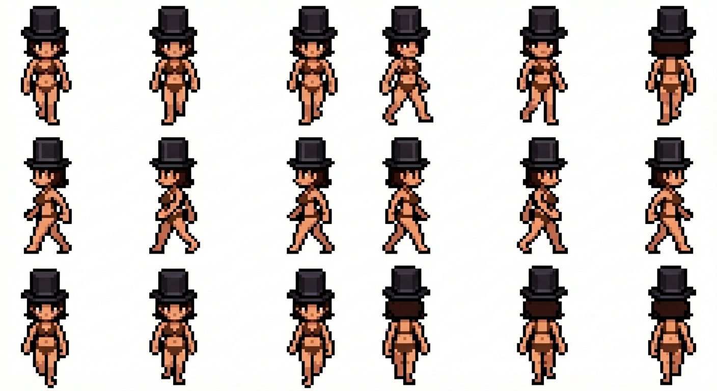 "white female with brown pigtails in brown bikini and black tophat , in Pixel Art style"