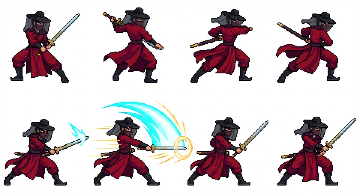 "【基础设定】 风格:纯正硬边缘像素艺术,无抗锯齿,颜色鲜明。 视角与方向:侧视45度,角色严格面向右侧。 比例:2.5头身,确保动作清晰。 输出:单张PNG,透明背景,128x128像素每帧,共8帧,横向排列,角色始终居中。 【角色与动作描述】 起始帧:角色呈战斗预备姿态,双手握绣春刀,刀尖斜右上45度,重心下沉。 蓄力帧(2-4帧):身体向右后极限拧转,双臂后拉做纳刀状,力量压缩。服饰产生向后飘动感。 爆发帧(第5帧):身体开始向左前回弹,刀刚挥出,刀尖出现初始刀光。 核心斩击帧(第6帧):身体完全展开,绣春刀挥出一道宽阔的扇形刀光。刀光为高亮青蓝到白色。伴随暖黄色速度线和刀尖的环状冲击波。这是最具动态张力的一帧。 跟随与收势帧(第7-8帧):刀光消散,角色调整姿态,回到一个更具进攻性的预备架势。 【颜色规范】 角色:深红(飞鱼服)、黑(帽、面纱)、金(装饰)。 特效:青蓝与亮白(刀光)、暖黄与白(速度线、冲击波)。 【禁止项】 禁止静态姿势。 禁止刀光方向不明确或暗淡。 禁止角色朝左。 禁止抗锯齿和写实渲染。”"