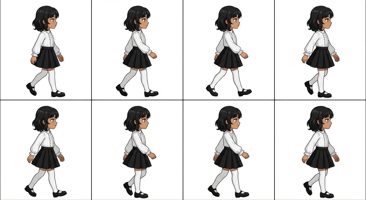 "white background, full body, girl, tan skin, short hair, wavy hair, black hair, grey eyes, black mary janes, white stockings, black skirt, pleated skirt, black pleated skirt, white blouse, long-sleeved blouse, frilly blouse"