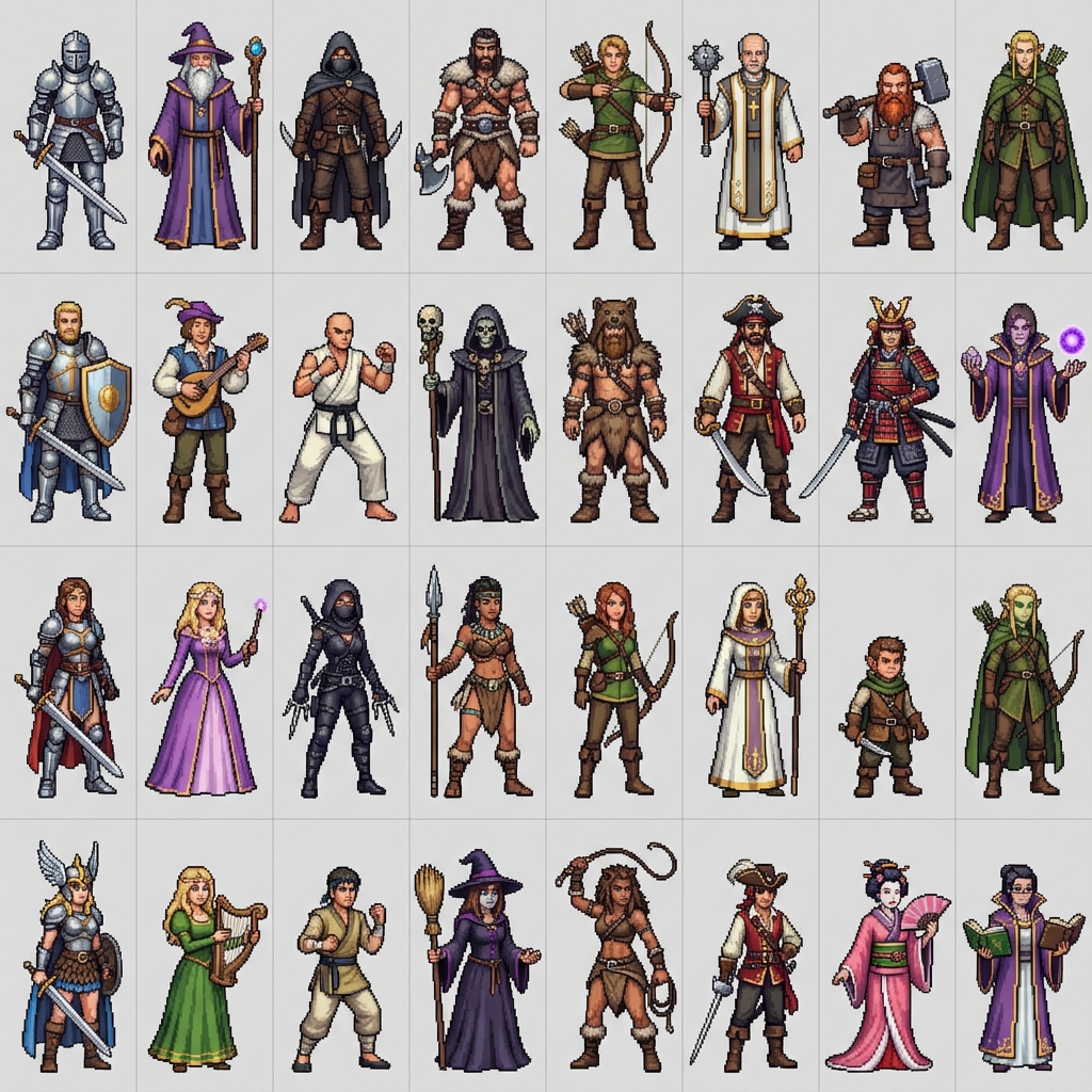 "I need a sprite sheet of 32 Fantasy RPG characters. 16 male and 16 female. These should be 128w x 256h each to make a 8 column, 4 row sprite sheet with transparent backgrounds that is 1024x1024 overall. Hi resolution pixel art with a variety of character types and looks."