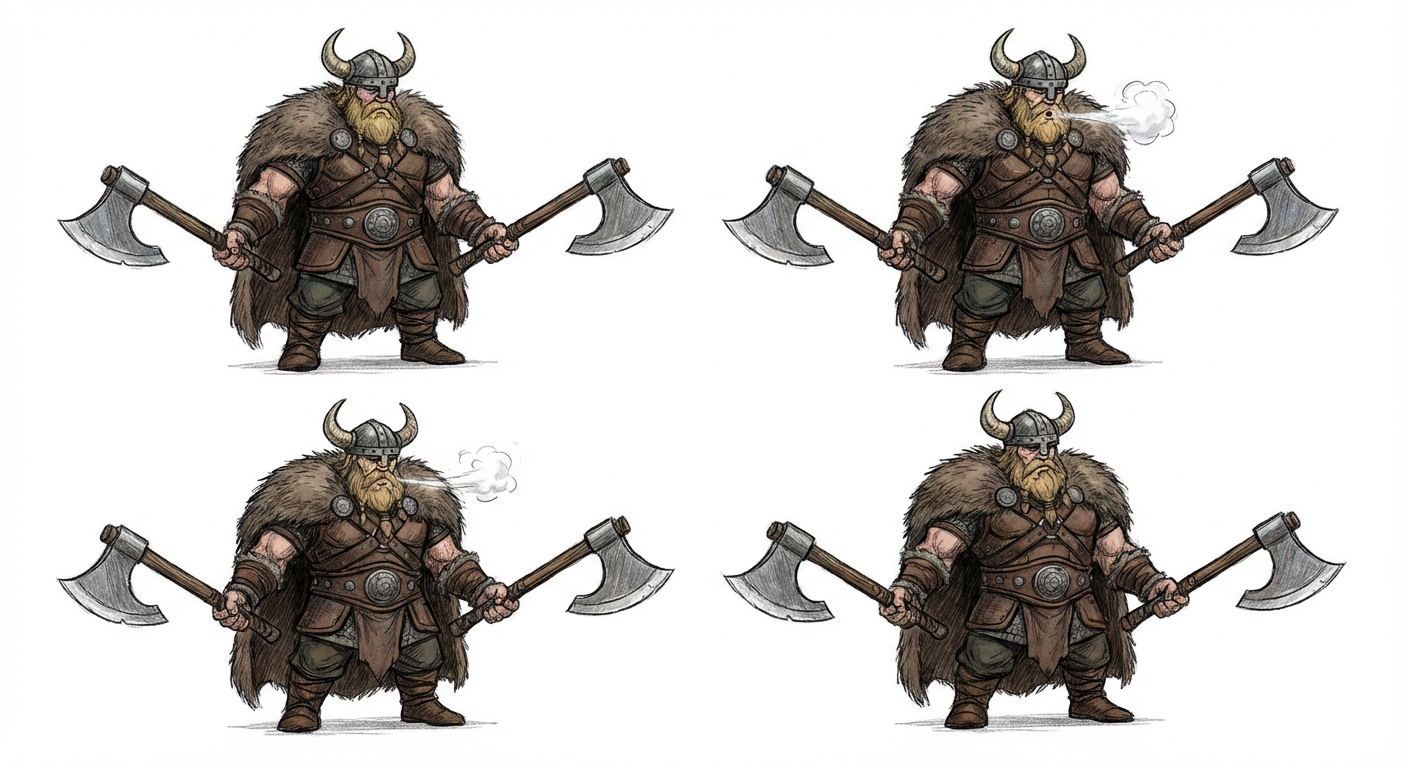 "big viking with holding two axes, in his idle animation you can see his breath, in Hand-Drawn Art style"