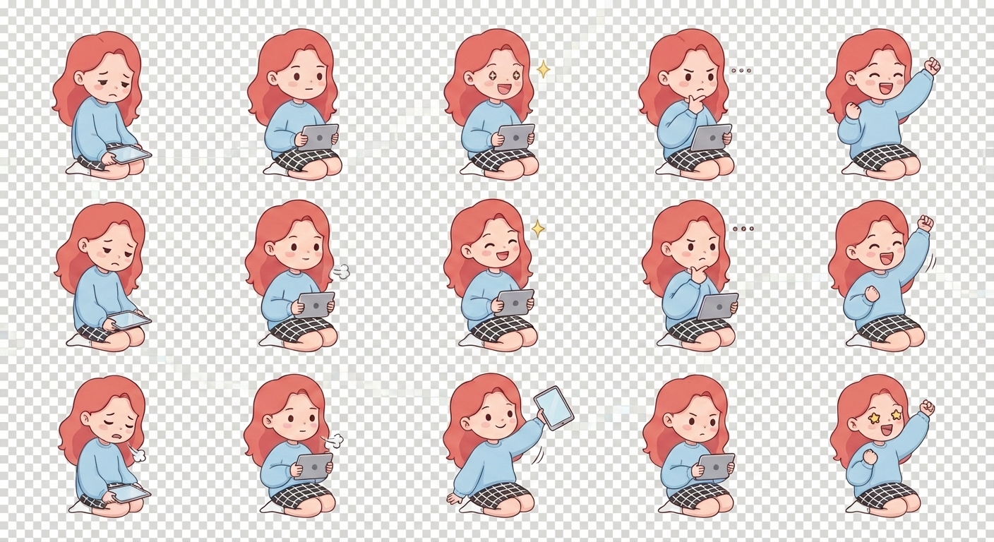"A cute 2D chibi-style girl character with soft red wavy hair, wearing a light blue oversized sweater and a black-and-white checkered skirt, sitting on the floor holding a tablet. Create a sprite sheet arranged in 5 columns and at least 5 rows. Each column represents one emotion with smooth animation frames from top to bottom: sad and tired calm/neutral happy and inspired focused and thinking excited and celebrating Keep the face shape, eyes, hairstyle, clothes, and proportions perfectly consistent across all frames. Only small changes in facial expression and body movement for animation. Clean transparent background, soft pastel colors, modern cute illustration style, game-ready sprite sheet, evenly spaced frames. flat 2D cartoon style, soft outlines, high consistency character model, no distortion, no extra characters, smooth animation transitions"