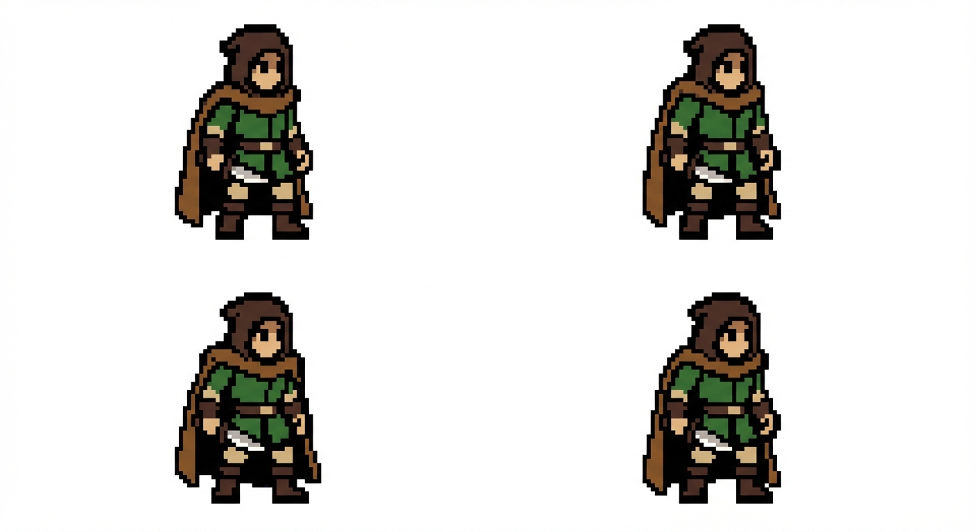 "16‑bit inspired, NES/SNES hybrid 3–4 color palette + outline Readable silhouette at 1× scale Medieval rogue Idle (4 frames) Subtle breathing Slight cloak or shoulder movement Knife lowered Loop-friendly"