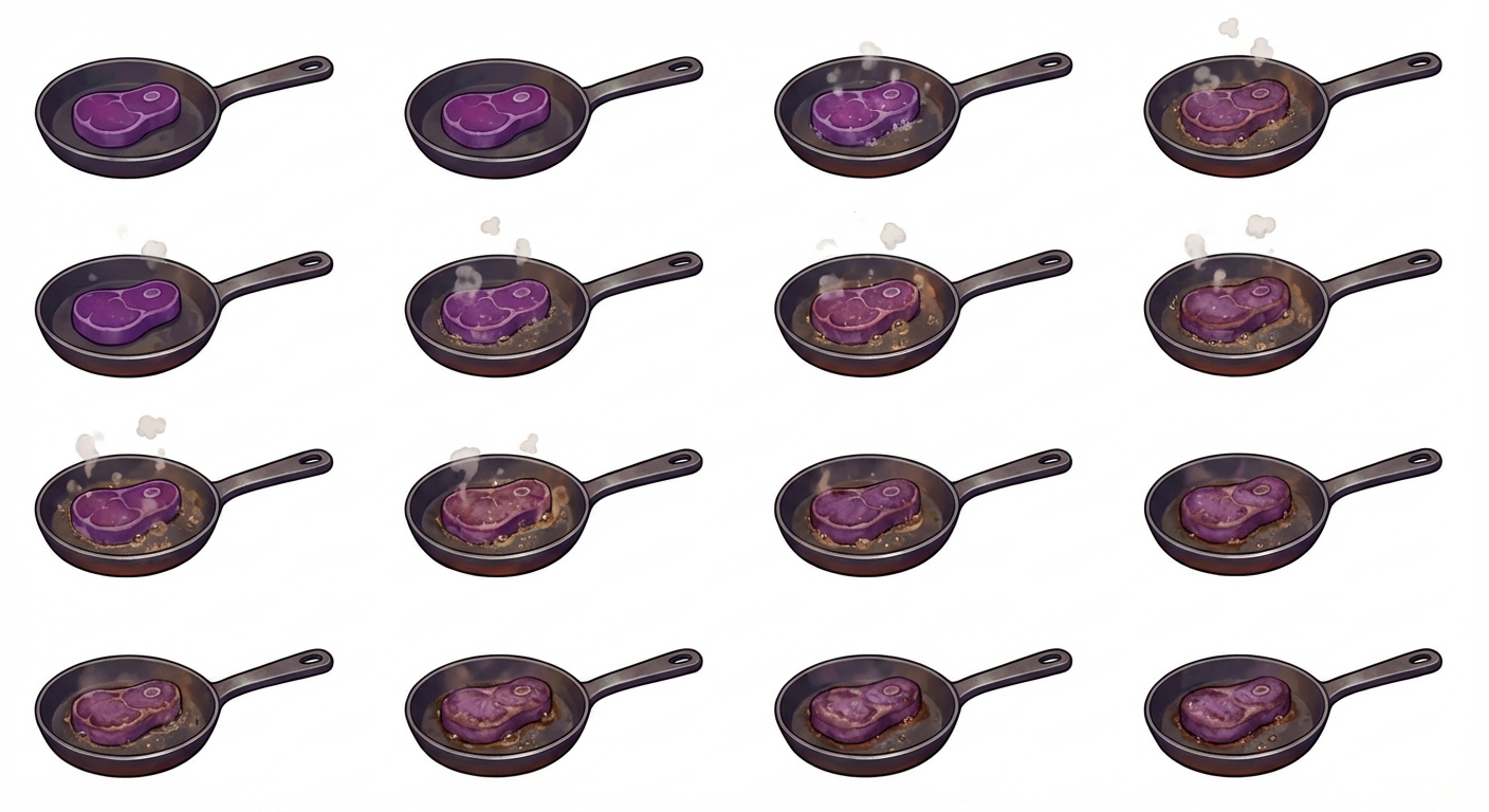 "a pan cooking a purple looking stake "