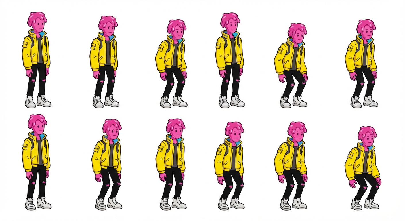 "Pink jelly skinny humanoid man with stylized hair made also of jelly wearing a yellow cyberpunk jacket, ripped black jeans and clunky white sneakers idle animation, bouncing up and down"