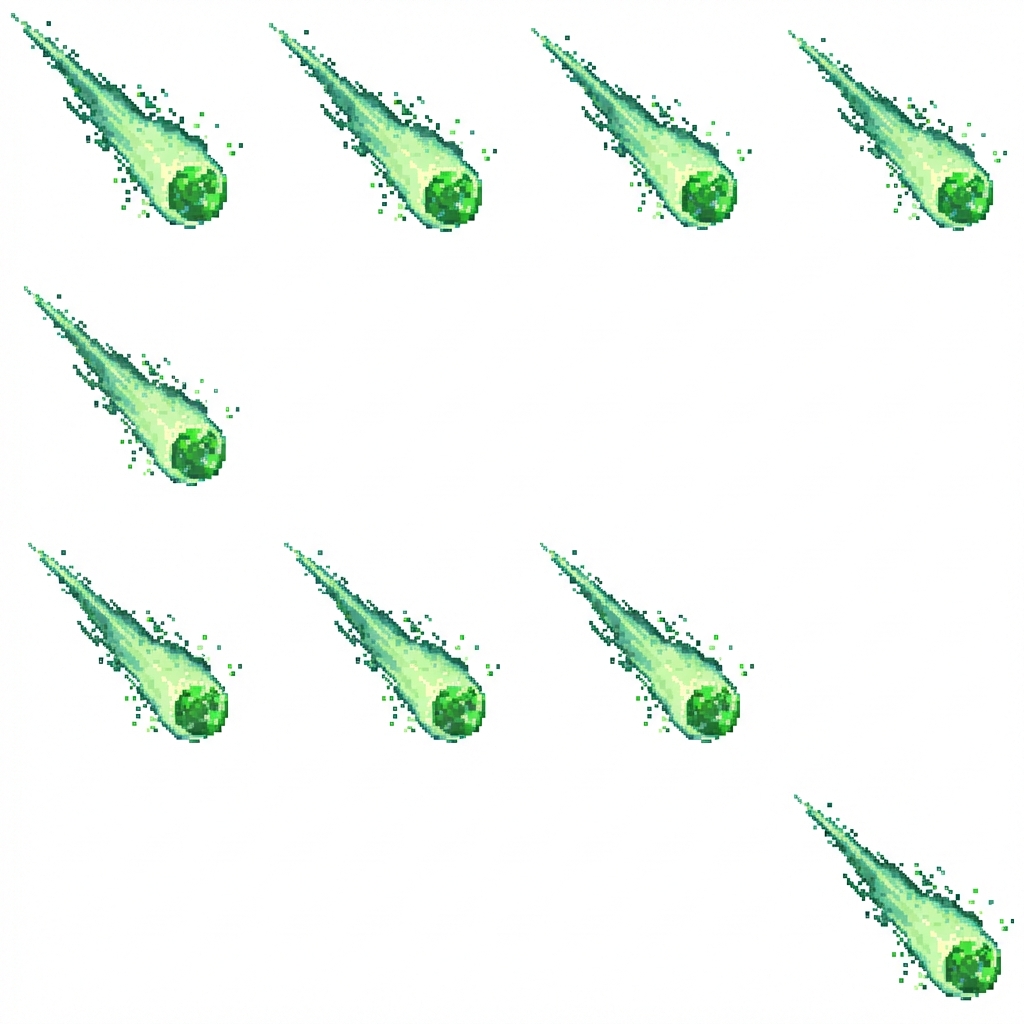 "Green meteor with glowing trail, in Pixel Art style"