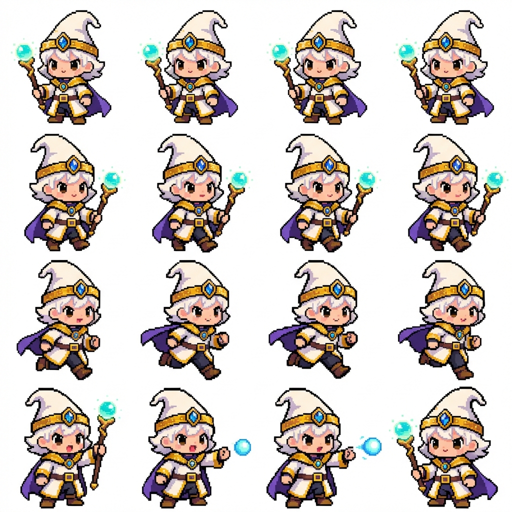"chibi wizard sprite sheet with idle, walking, running, and basic attack sprites"